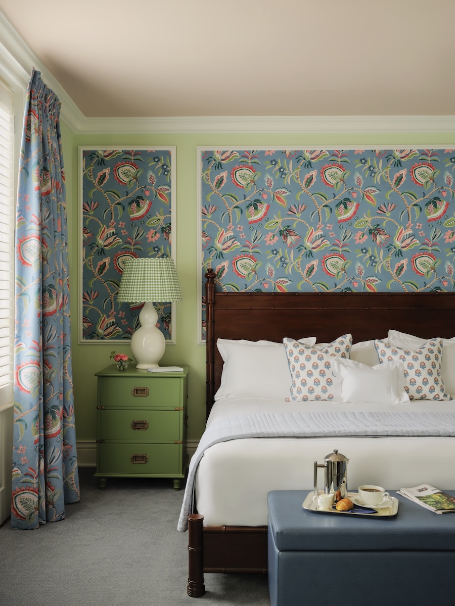 Guided by the vision of owner Mrs. Deborah Royce, the renovation draws inspiration from the Gilded Age tradition of florals, interpreted through a more vivid and contemporary lens. The result is a collection of guest rooms that feel both timeless and personal. Spaces designed to evoke the warmth and comfort of staying in a friend’s seaside New England cottage, where elegant details meet an inviting, lived-in charm.